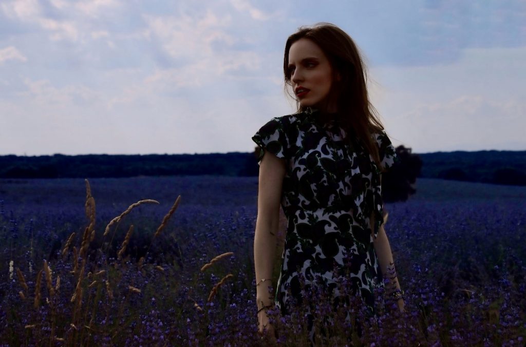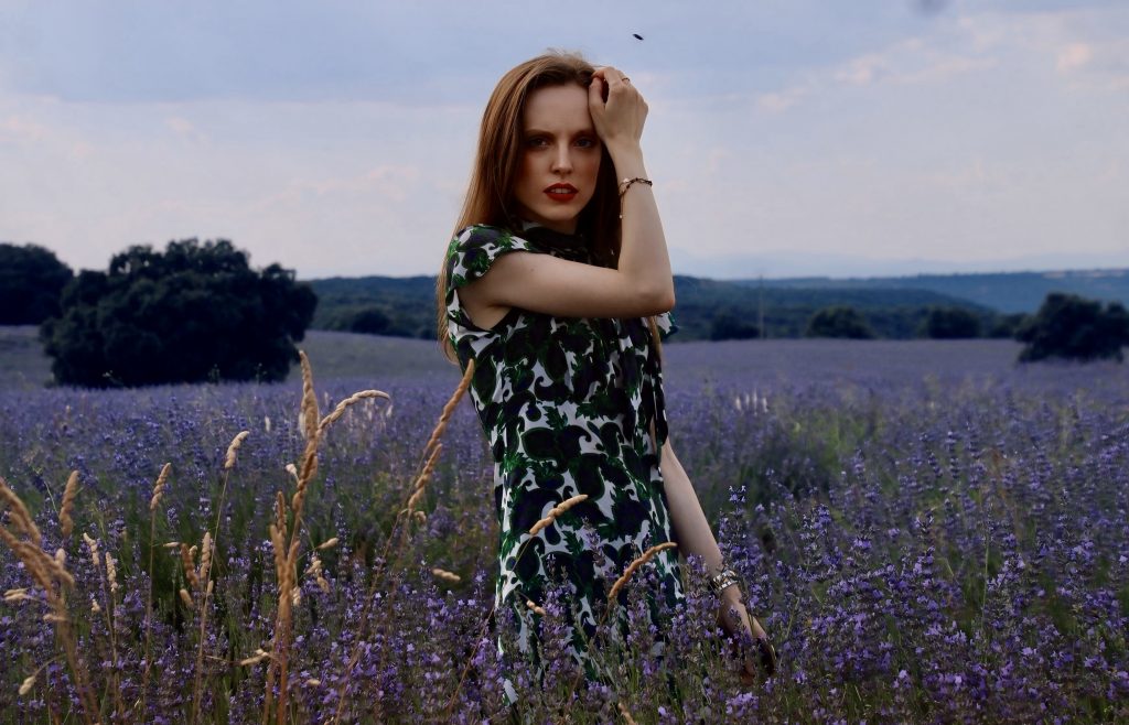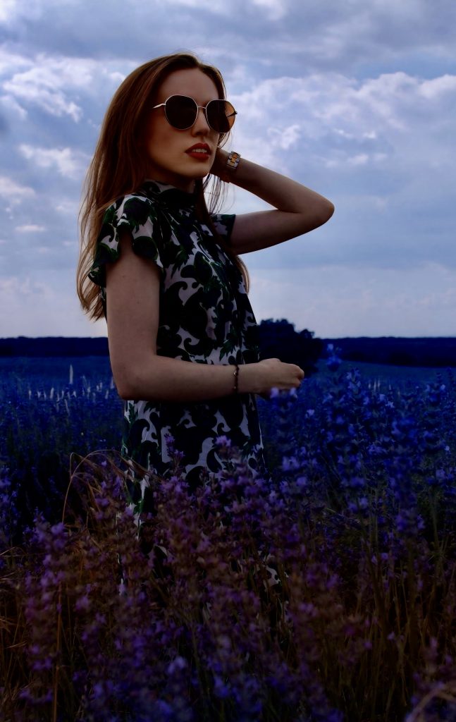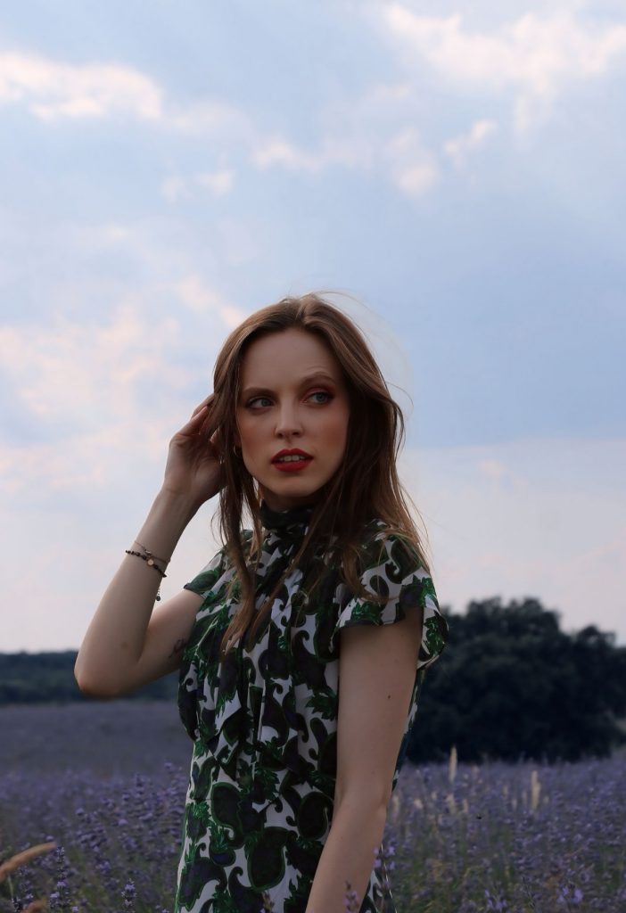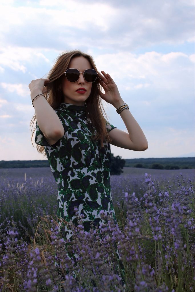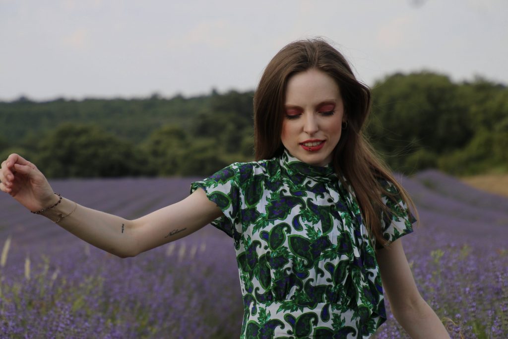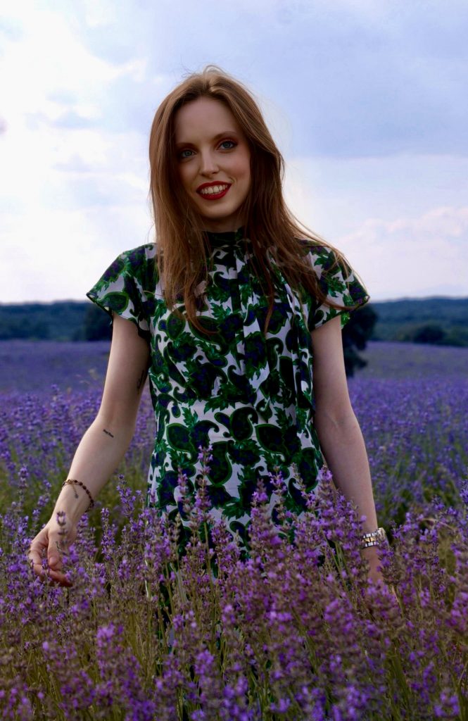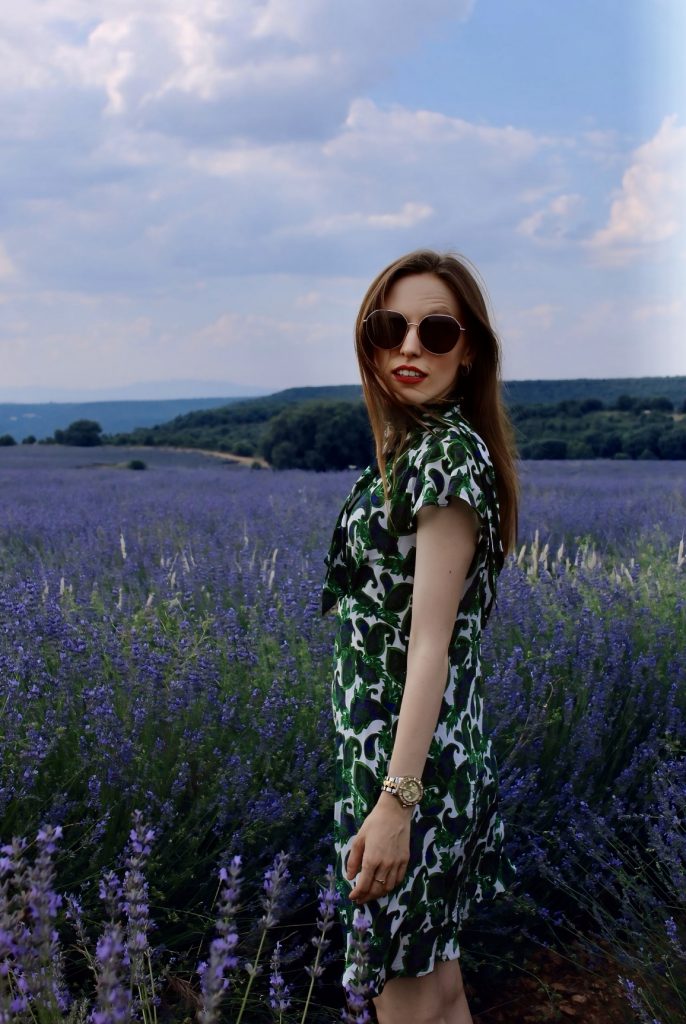 En medio de ese escenario, elegí llevar un vestido de Sandro que parecía hecho para ese instante. Su estampado botánico en verdes profundos y morados intensos dialogaba con el entorno de forma casi simbiótica. Como si el diseño hubiera sido inspirado en ese mismo campo de lavandas donde caminaba.