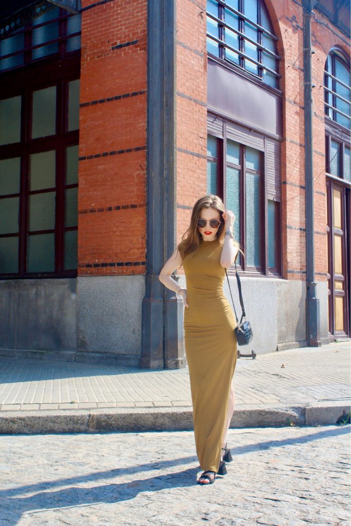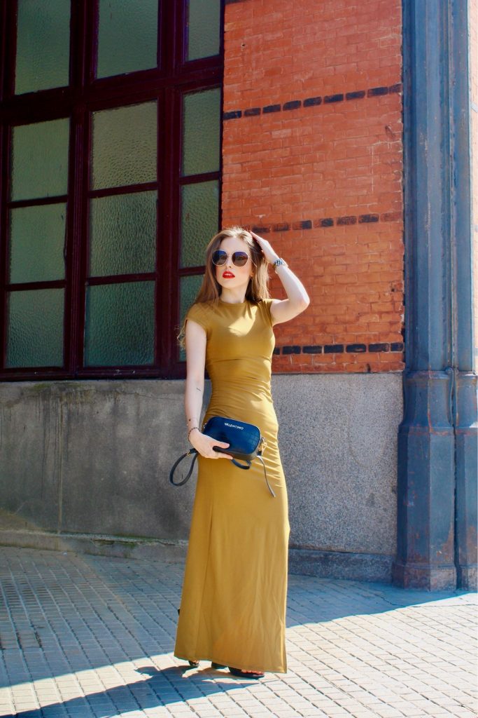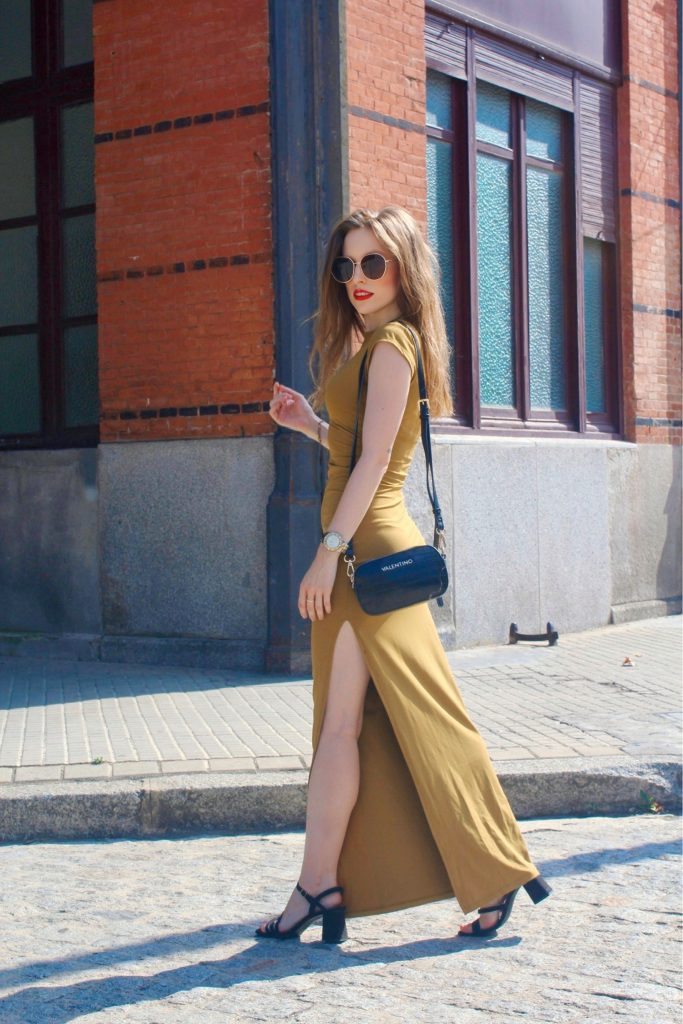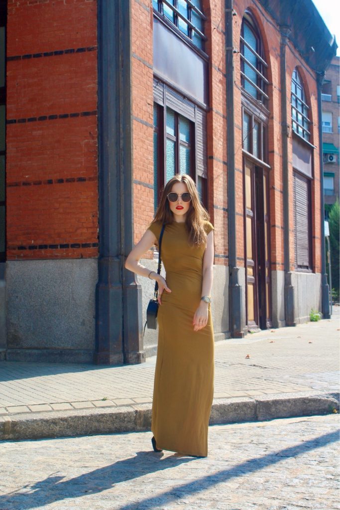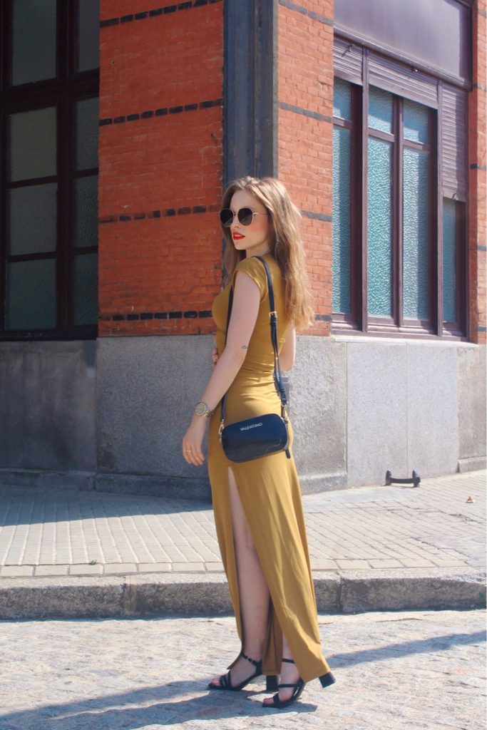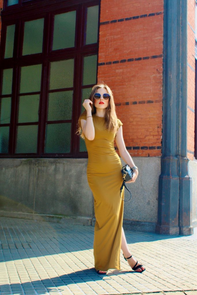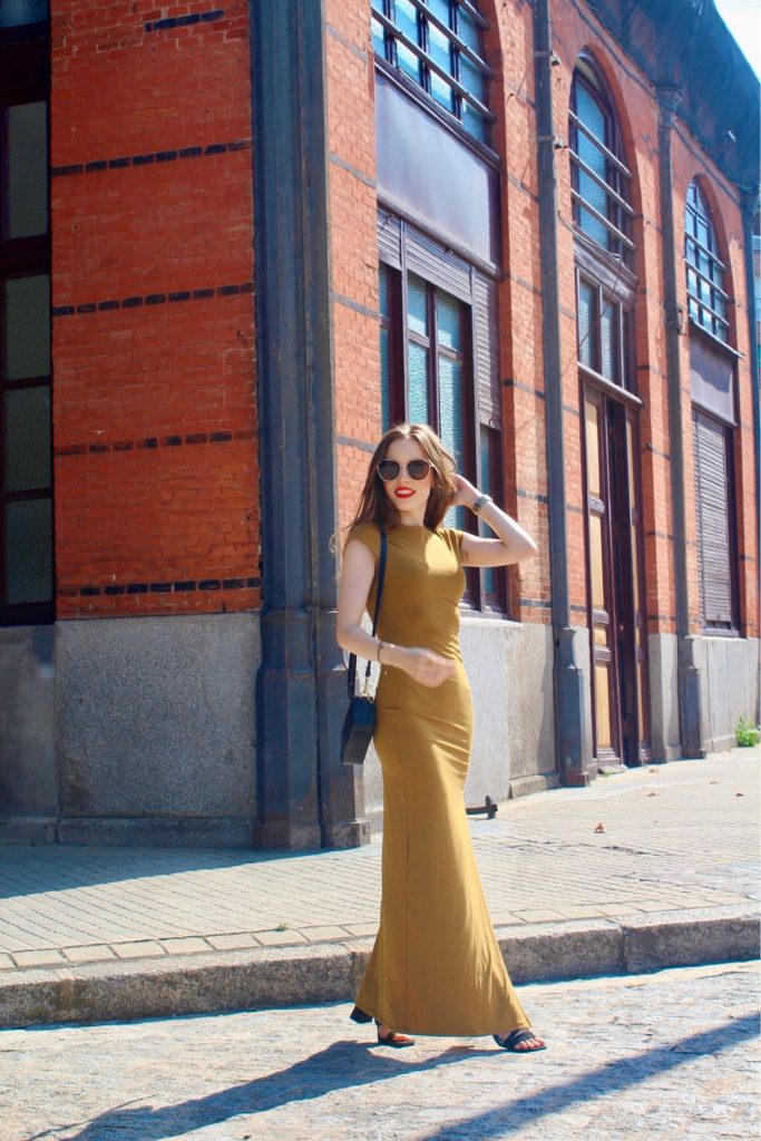El street style tiene la magia de transformar una prenda sencilla en un statement de estilo. Un vestido largo en tono mostaza, de corte limpio y ajustado, se convierte en la pieza protagonista de un outfit sofisticado y atemporal.