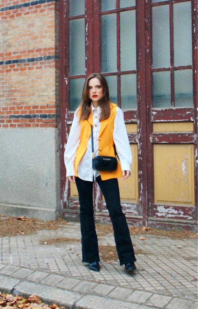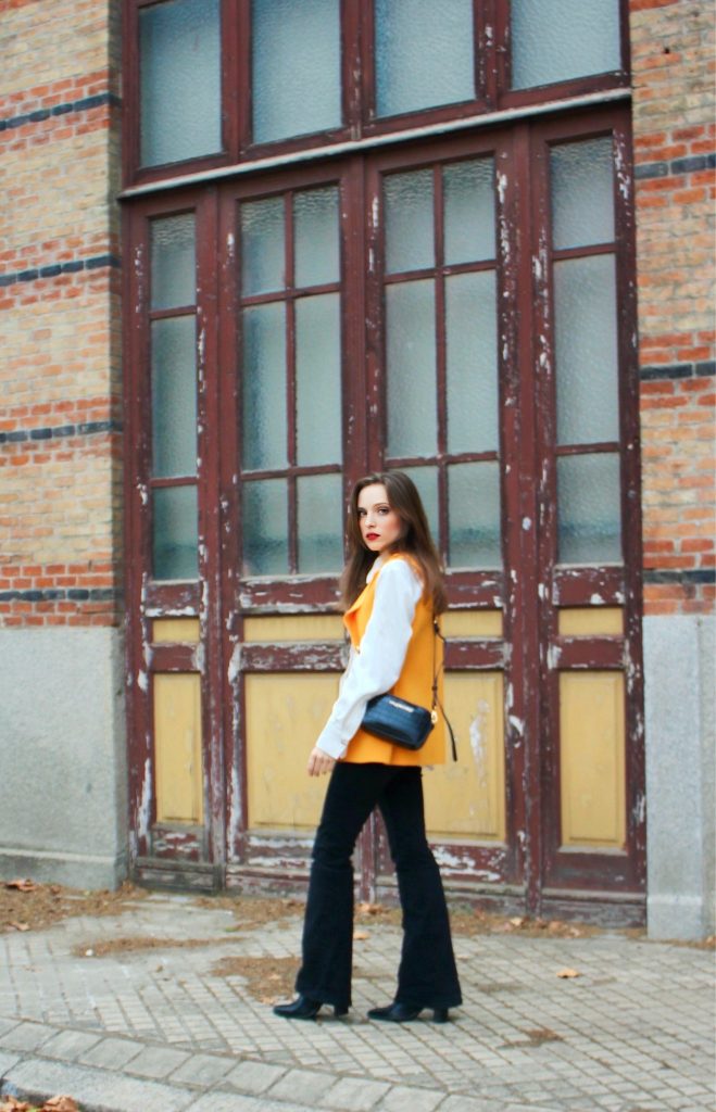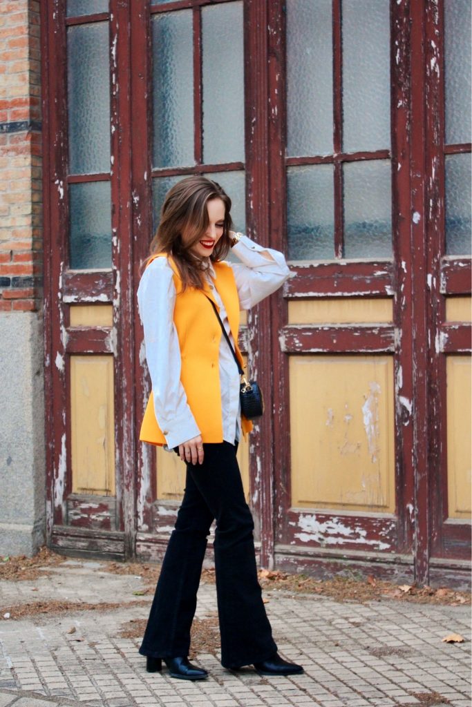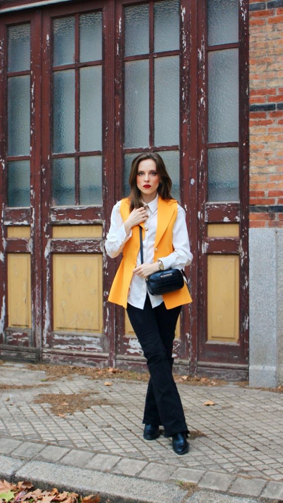 El protagonista absoluto del outfit es un chaleco estructurado en tono mostaza. Este color ilumina el conjunto y aporta ese toque de energía que tanto me gusta en los días de otoño.