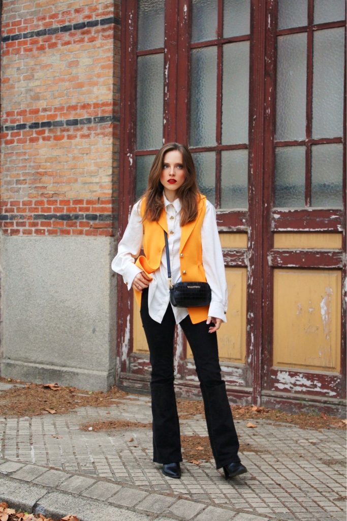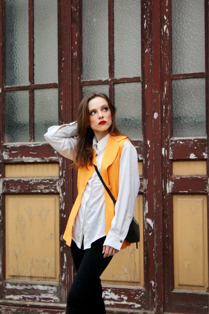 Seguimos con lo que es para mí un básico de armario imprescindible, una camisa blanca de corte amplio. Su estructura aporta equilibrio al color llamativo del chaleco, manteniendo la armonía del look.