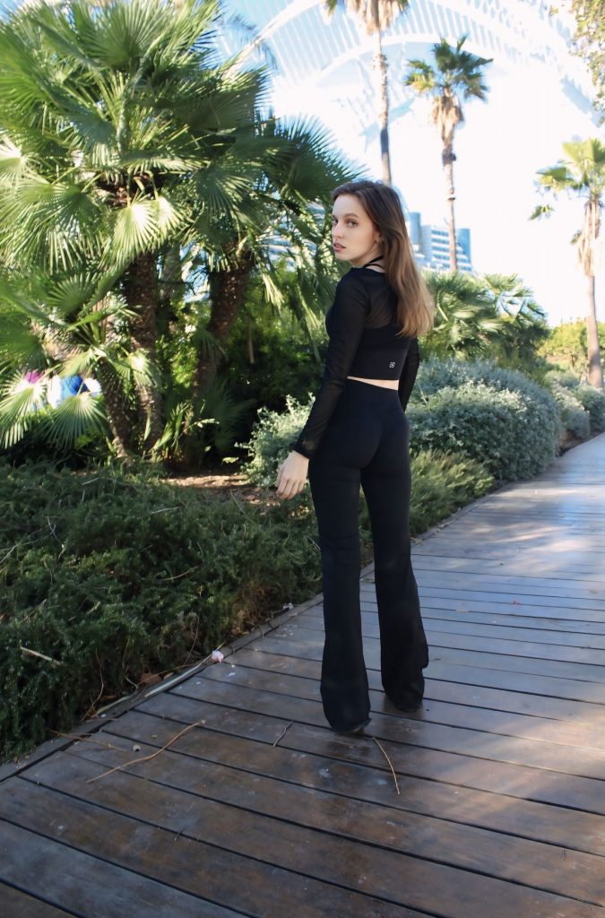 El pantalón deportivo de tiro alto y corte flare alarga visualmente la silueta y aporta ese toque sofisticado que transforma por completo un look sporty.