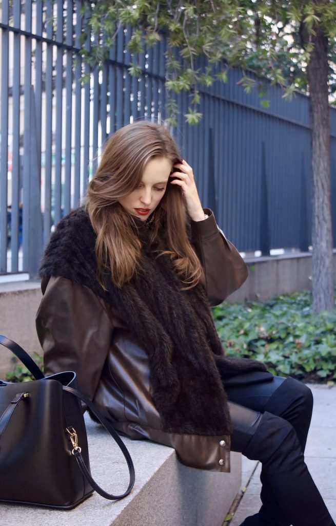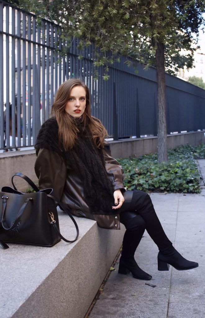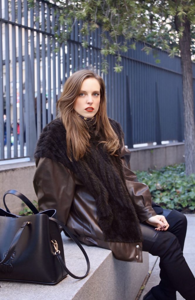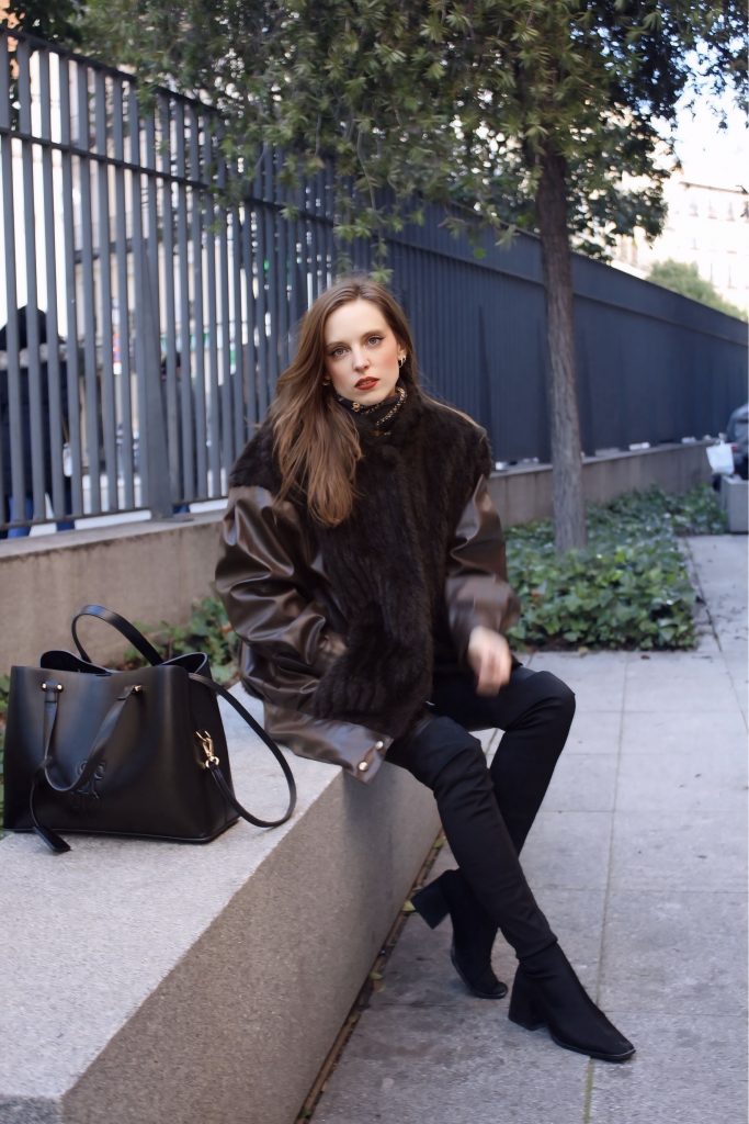 – Chaqueta de textura (tipo pelo o borreguito) → suaviza el conjunto y crea contraste de materiales