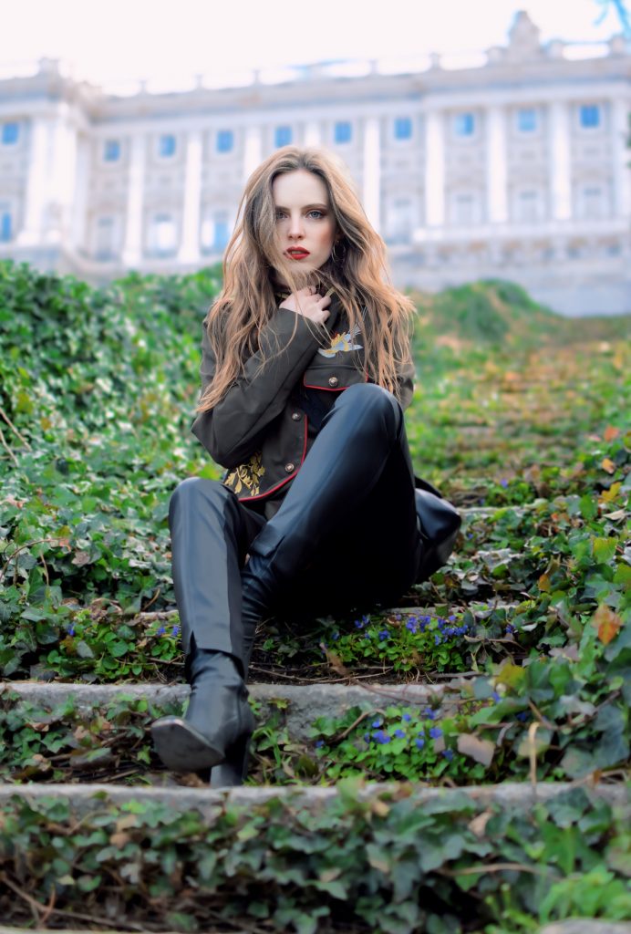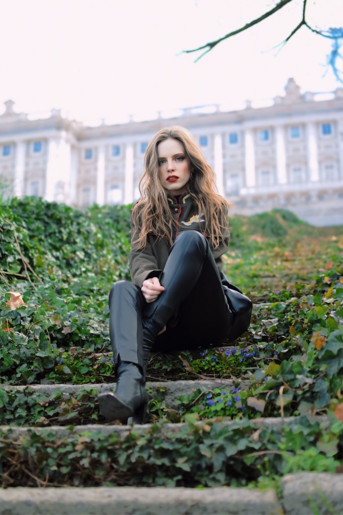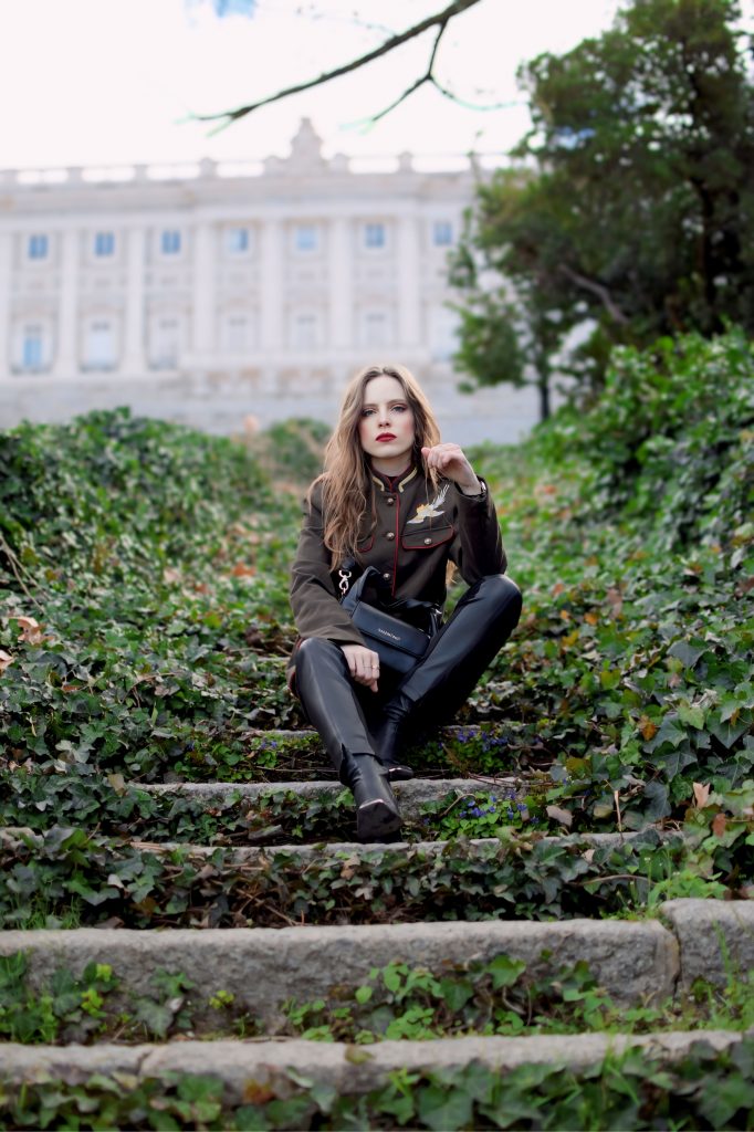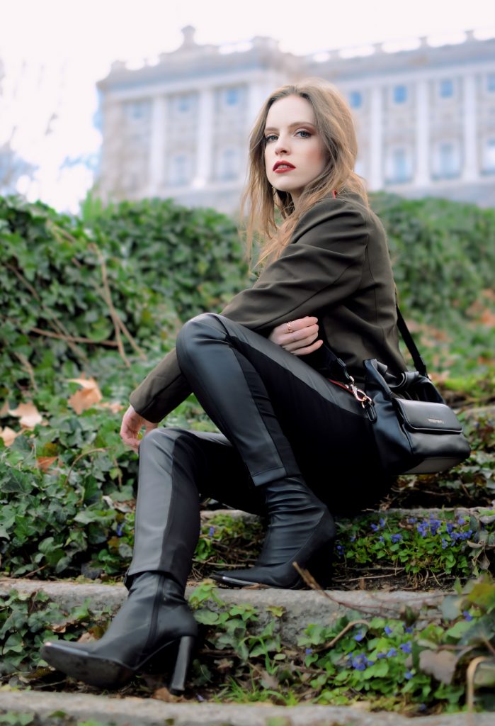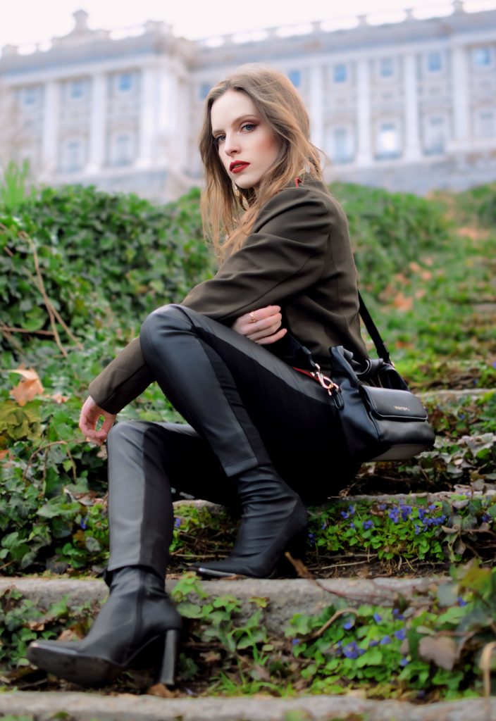 Por todo ello y con la idea de no restarle protagonismo, he decidido combinarla con un jersey de cuello negro debajo que actúe de base del look . Para la parte de abajo, un pantalón de polipiel que consigue seguir con esa estética guerrera y unos botines de tacón que se agarran perfectamente al tobillo y se desdibujan con el pantalón, aumentando la sensación visual de vernos mucho más estilizados.