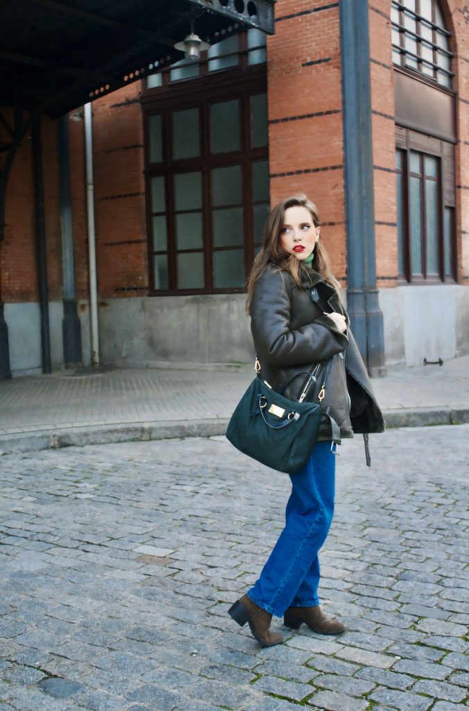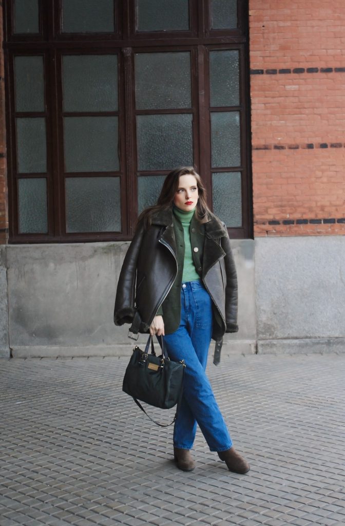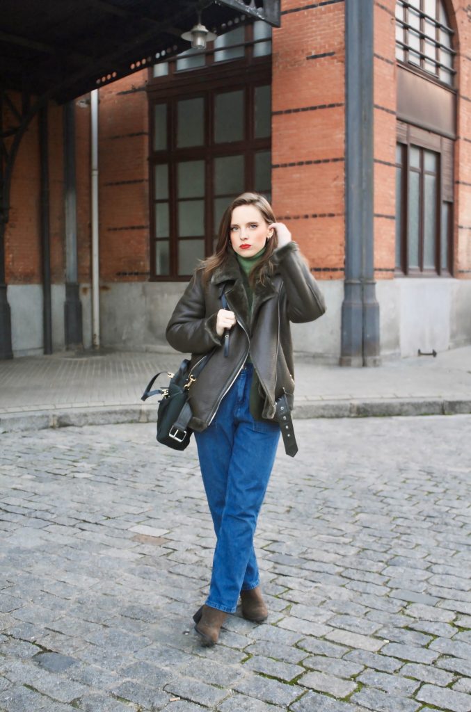 En la segunda foto, el mismo look cambia por completo al añadir un abrigo tipo aviador con borreguito.