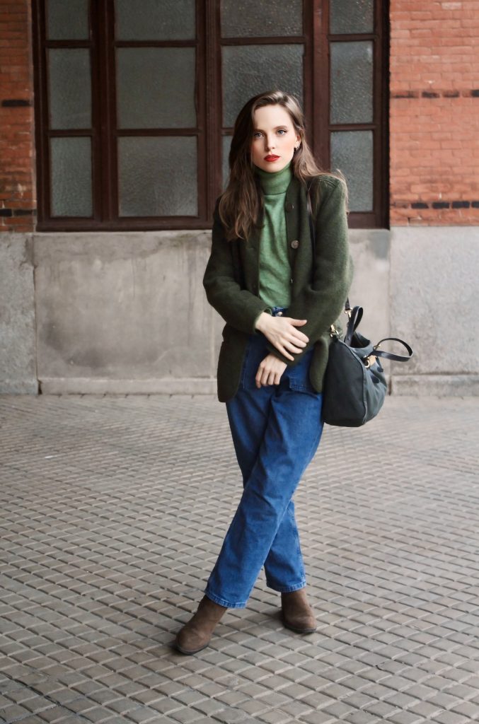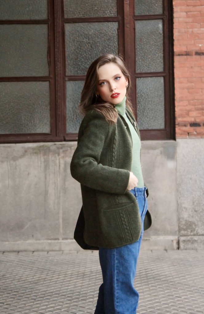 En la primera imagen llevo el look con una chaqueta verde, que mantiene la ligereza del conjunto.